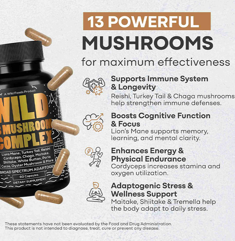 The Wild Mushroom Supplement contains 13 types of powerful mushrooms, all USDA-certified organic, for immunity, longevity, and overall health!