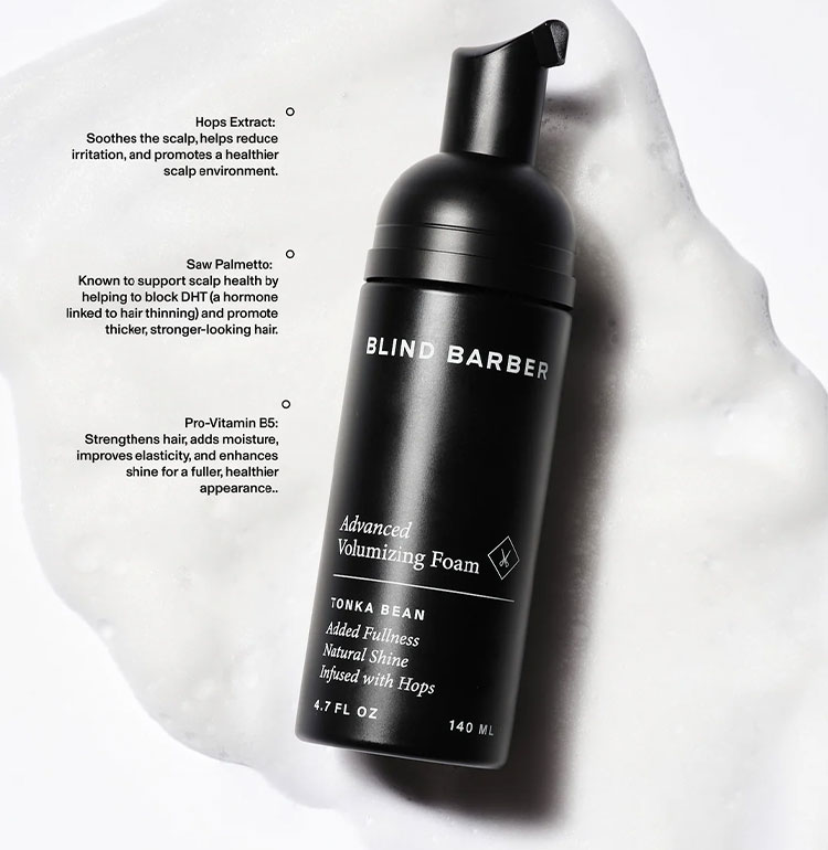 Blind Barber's Advanced Volumizing Foam adds serious fullness and flexible hold for lasting volume without the weight. Use it to boost texture or create a thicker, fuller look—no crunch, no residue. Infused with Hops Extract to soothe the scalp, Pro-Vitamin B5 for shine and elasticity, and Saw Palmetto to support scalp health. The result? Hair looking fuller, feeling healthier, and holding strong from morning to night.