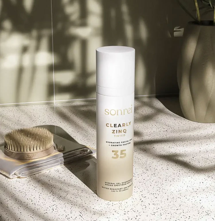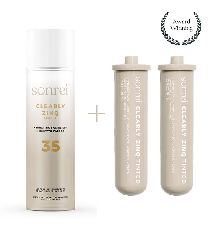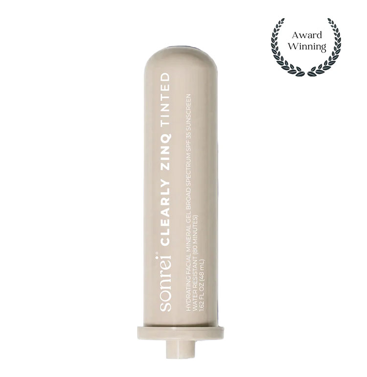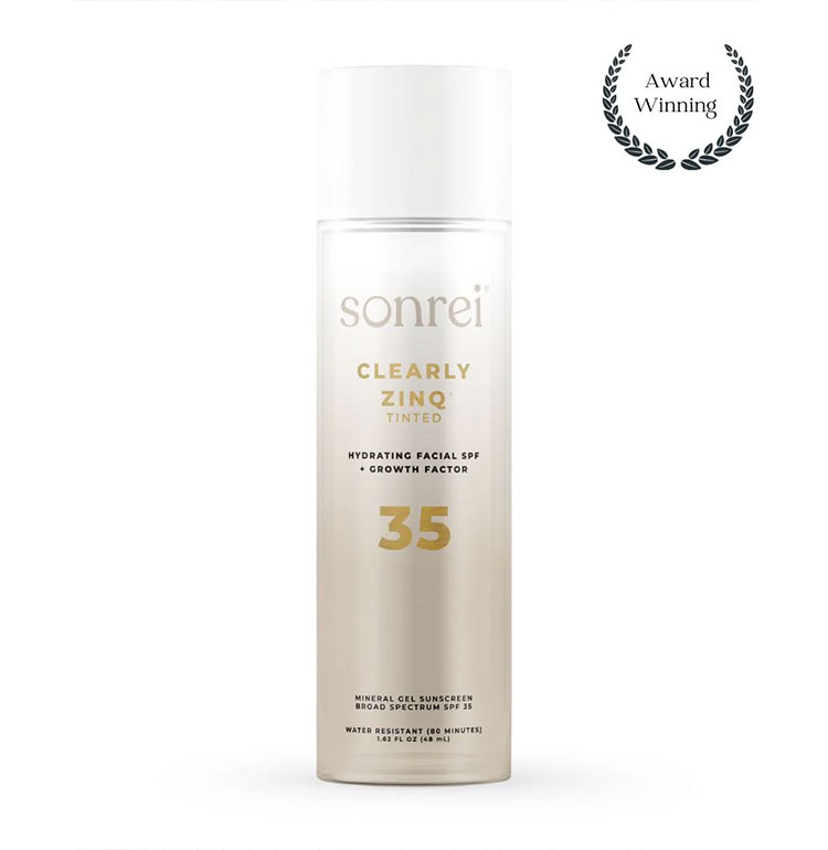 Sonrei’s acclaimed tinted mineral face sunscreen is a versatile, broad-spectrum SPF 35 gel with the growth factor, kinetin, that also doubles as a primer.
