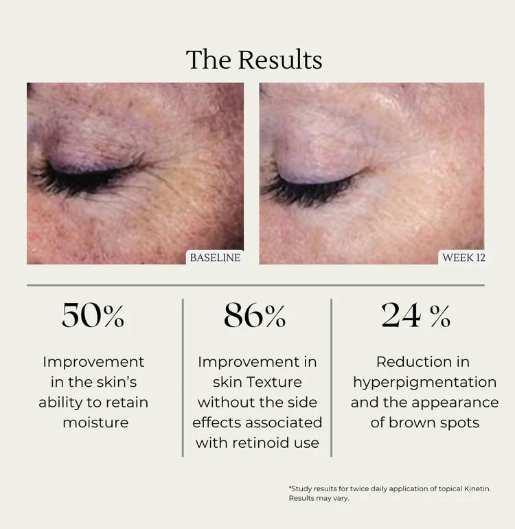 In clinical studies Kinetin has been shown to help the skin retain moisture and reduce the effects of skin aging, including roughness, fine lines, wrinkles, dilated blood vessels & uneven pigmentation without irritation.