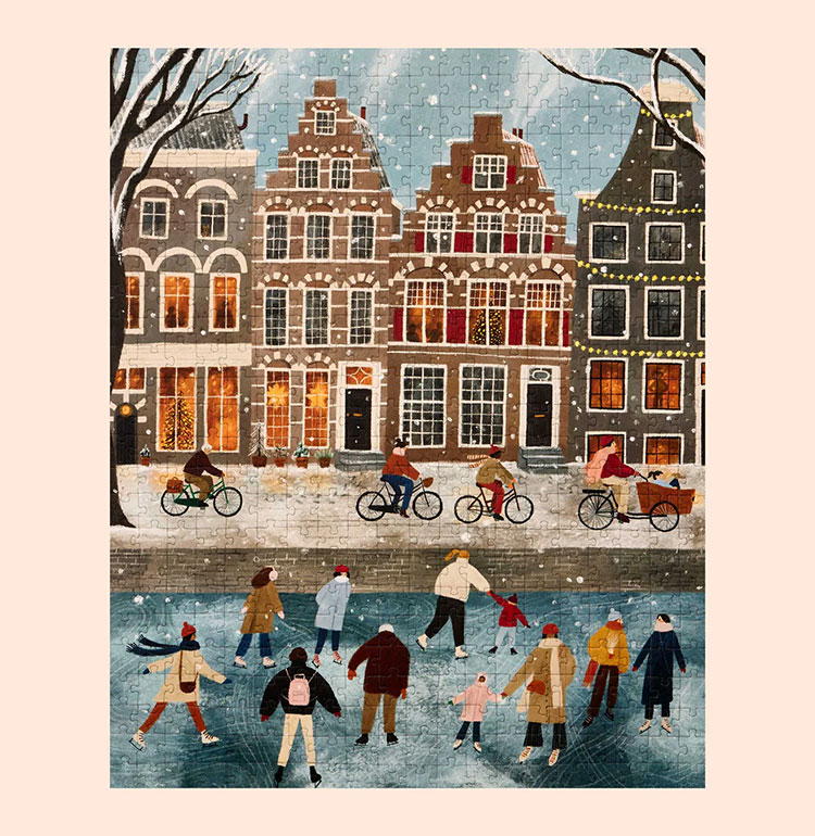 Snow Day In Amsterdam This charming puzzle by Rachel Victoria Hillis captures the enchanting beauty of a winter snow day in Amsterdam during the cozy holiday season. The scene sparkles with fairy lights and a gentle dusting of snow, while joyful people move through the streets in good spirits. It's an invitation to pause and savor life's simple moments while reflecting on the year past and welcoming new beginnings. Perfect for embracing the peaceful magic of European winter holidays.