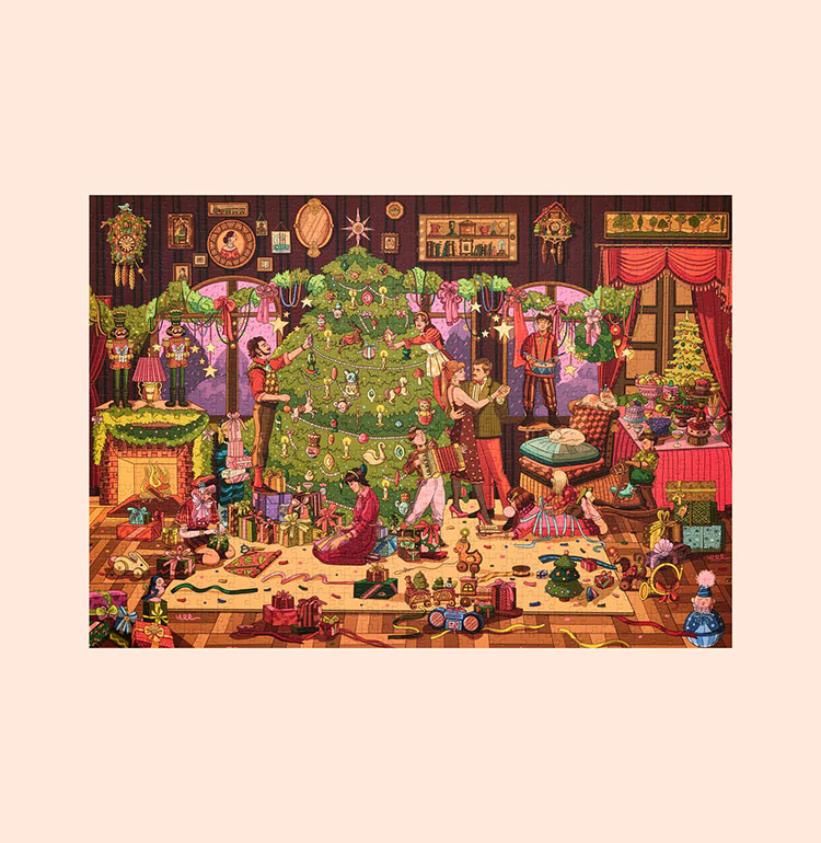 Christmas Eve Sarah Long's festive 100-piece puzzle captures the magical atmosphere of Christmas Eve when the house hums with anticipation and joy. Music drifts from downstairs as parents dance with full hearts while the tree twinkles and wrapped gifts wait patiently beneath. Meanwhile, wide-eyed children hover near windows, certain they might catch a glimpse of a sleigh streaking across the starlit sky. This enchanting mini puzzle brings all the wonder and warmth of Christmas Eve into one perfectly sized treat.