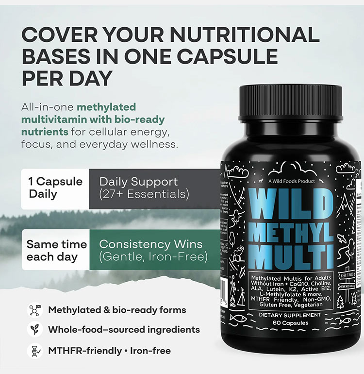 Support steady energy, a clear head, healthy hair/skin/nails, and everyday vitality— in one simple habit. Wild Foods Methyl Multi uses pre-converted (methylated), bio-ready B-vitamins—including L-5-MTHF (active folate) and methylcobalamin (active B12)—so your body can use them right away to support cellular energy, focus, mood, and immune health.