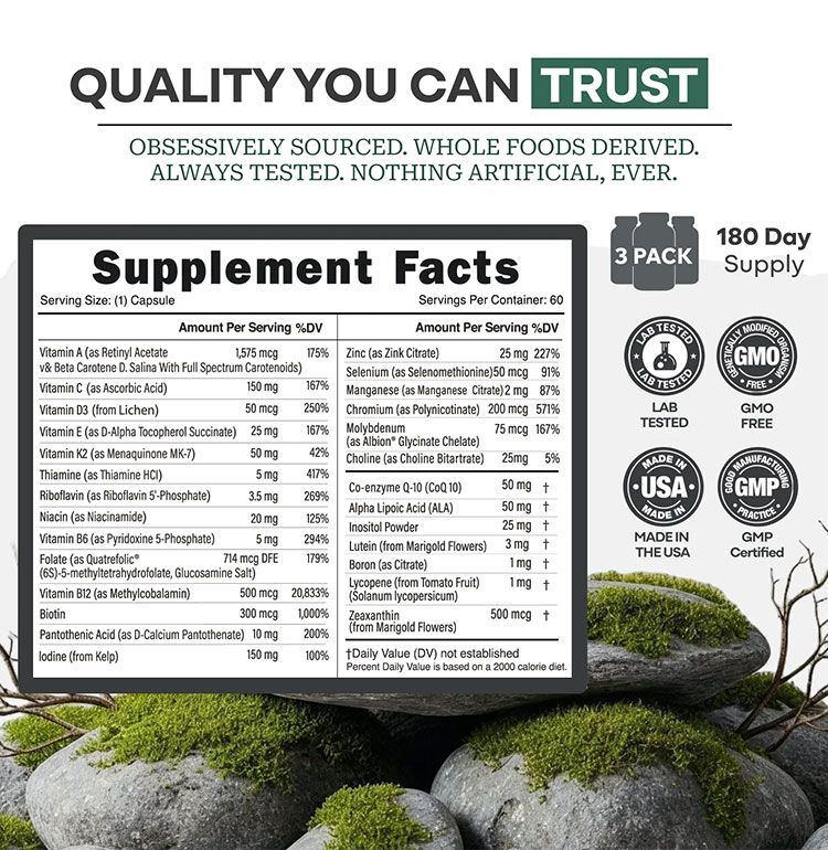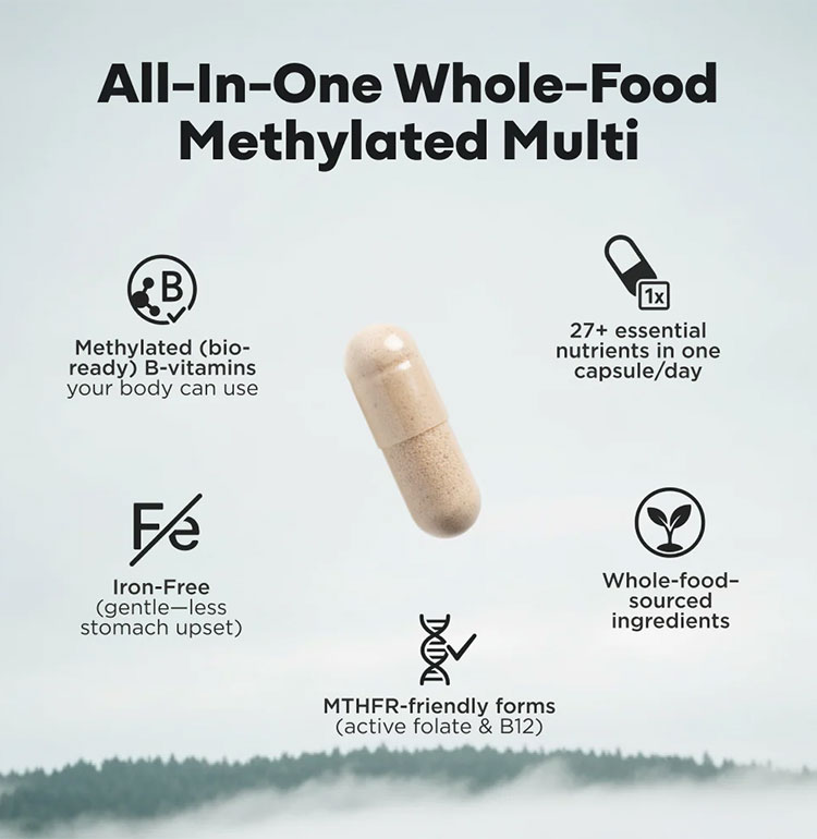 You get 27+ essentials (a broad spectrum of vitamins plus important minerals and antioxidant nutrients) in one iron-free capsule per day, designed to be gentle and easy to take, with whole-food–sourced ingredients where it matters. It’s MTHFR-friendly by design and supports healthy methylation and normal cellular antioxidant defenses.