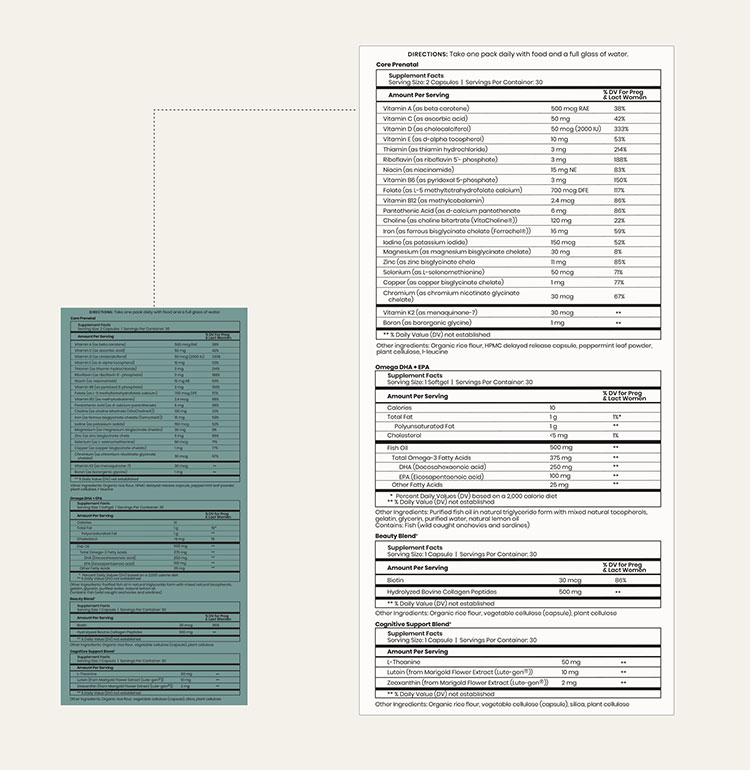 Omega DHA + EPA: EPA supports the heart, immune system, and your inflammatory response. DHA supports the brain, eyes, and central nervous system.Omega-3 fatty acids are crucial for your baby’s brain development and for supporting your mood. Throughout pregnancy, EPA plays an important role in helping DHA cross the placenta, which is why both are included in the formulation. Plus, they use the triglyceride (TG) format of omega in our products, which is safer and more absorbable.
