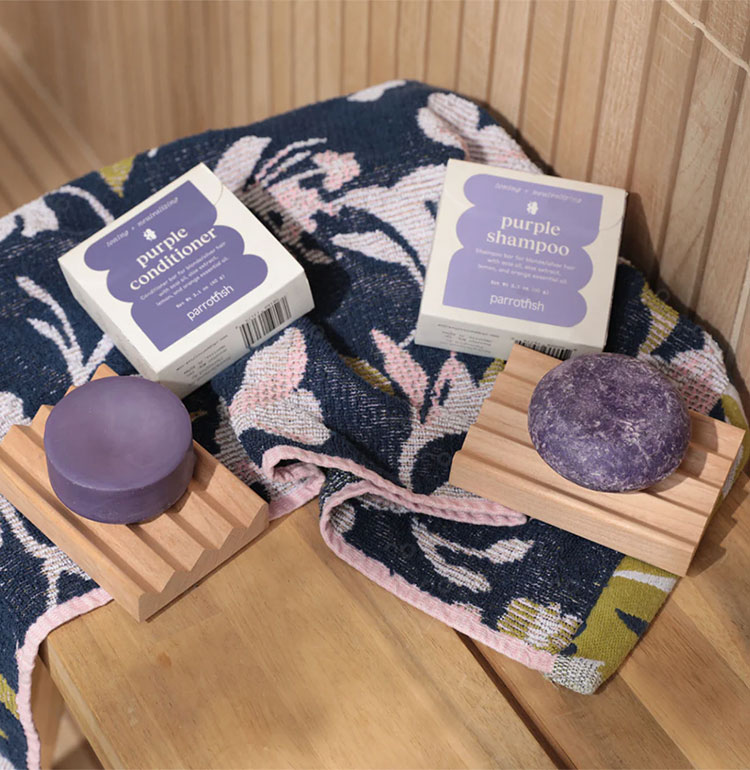 Toning shampoo and conditioner bars for blonde or silver hair with acai oil, aloe extract,lemon, and orange essential oil and floral notes.