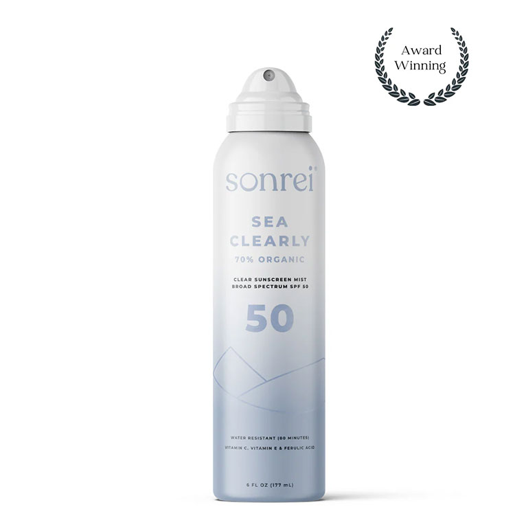 Sonrei’s clear mist represents an elevated standard in sun care infused with 70% certified organic ingredients and potent antioxidants, delivering broad-spectrum UVA/UVB protection suitable for all skin types and tones.