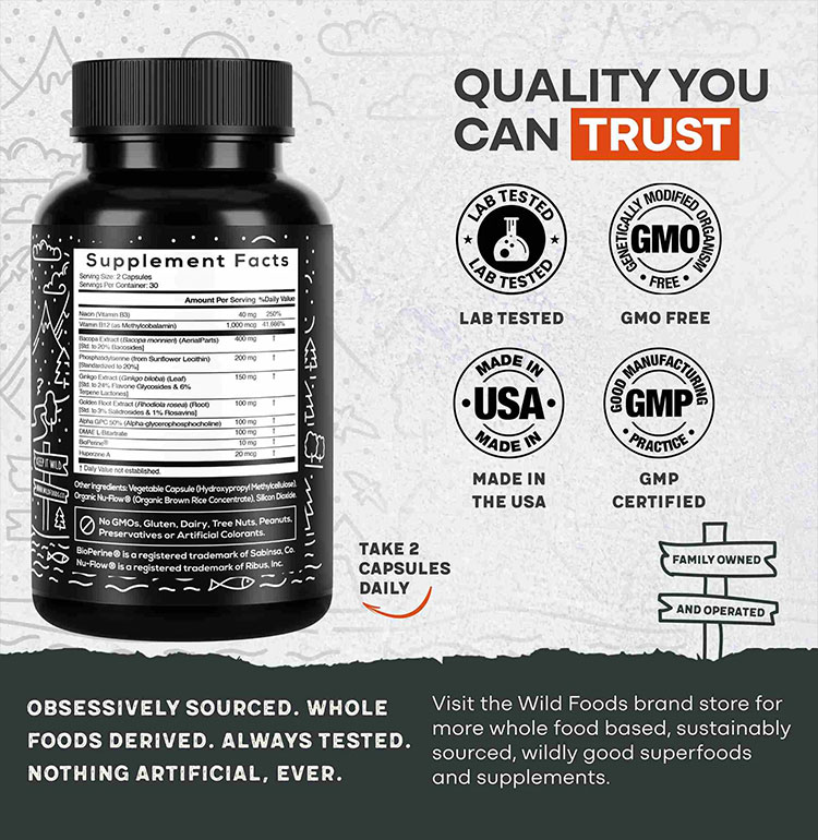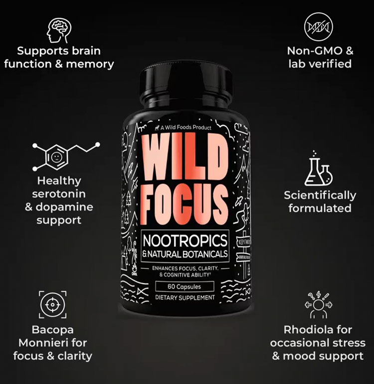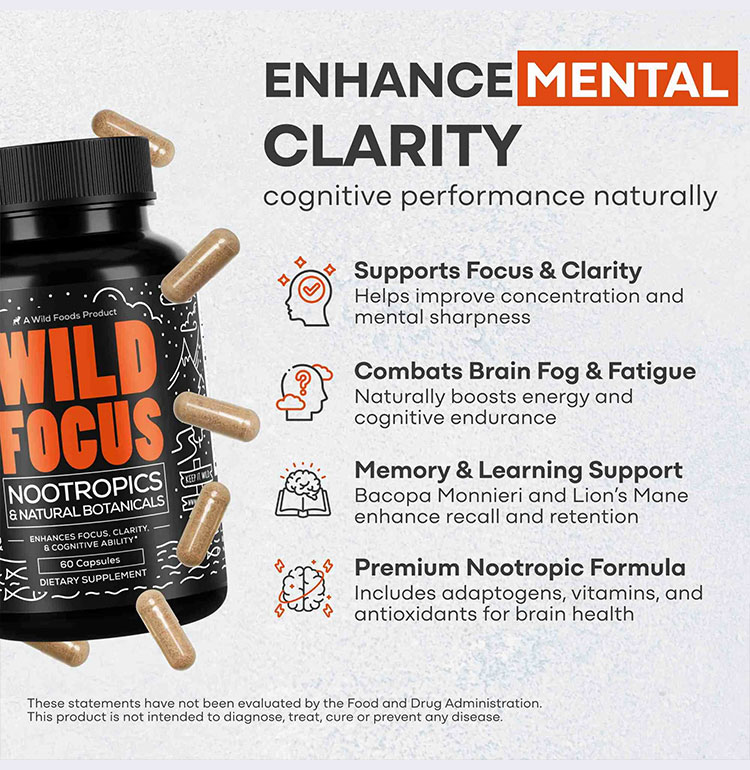 NATURAL BRAIN AND FOCUS BOOSTER:Harnessing the power of potent plant sources to boost your brain while stimulating antioxidant activity to reinforce your immune system. ALWAYS PURE AND PREMIUM: Wild Focus is 100% GMO-Free and 100% Gluten-Free and formulated and made in the USA following strict cGMP guidelines to ensure optimal ingredient purity and potency so you can feel confident knowing you’re getting the highest quality nootropic available. CAREFULLY FORMULATED: To help fight off brain fog and mid-afternoon fatigue and improve mental clarity acutely so you can perform your best